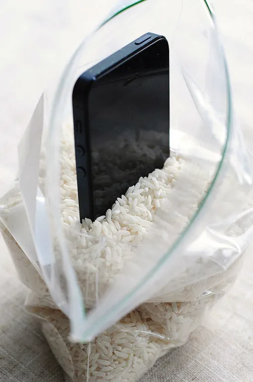 И хит программы: утонувший телефон. Правило спасения — сразу выключить, если есть возможность, то отделить аккумулятор. И засунуть на сутки в пакет с рисом.