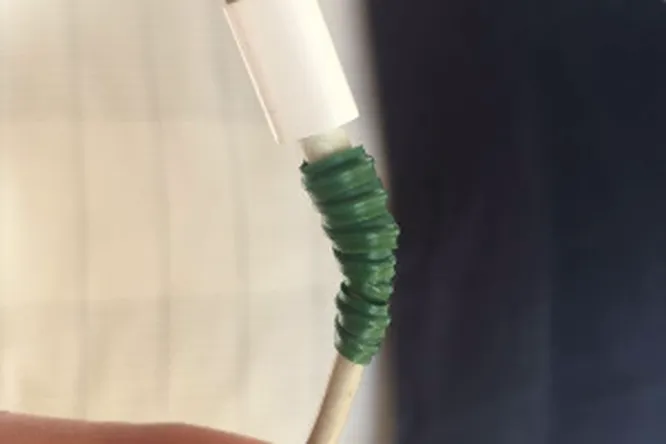 Итак, у вас внезапно сломался провод на зарядном устройстве вашего Айфона. Он у всех ломается. Берем обычную пластиковую ленту, которой запечатывают пакеты с хлебом, и сворачиваем ее спиралью. Готово!