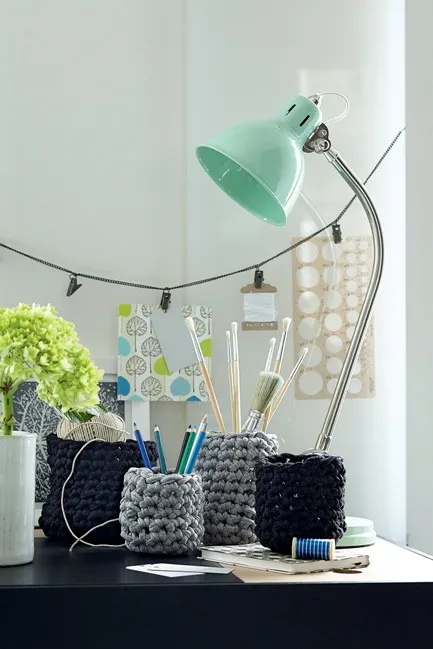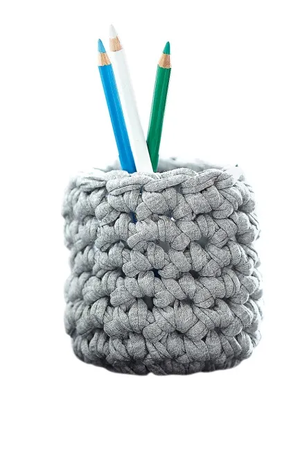 Чтобы создать очаровательные вязаные подставки для письменных принадлежностей, вам понадобится пряжа из трикотажного полотна. Ее можно купить уже готовую, но, если подходящей найти не удастся, нити не так сложно изготовить самостоятельно. Просто разрежьте старые футболки по горизонтали на ровные тонкие полосы и растяните их так, чтобы трикотаж скрутился в нить. Сделать это не сложно, и в Интернете можно найти массу видео и фото мастер-классов, обучающих этой технике. Начинайте вязать контейнер по кругу, ряд за рядом добавляя петли. Чем больше рядов вы свяжете, тем выше будет подставка. После того как будет связан последний ряд, руками расправьте подставку, придав ей аккуратную форму. Попробуйте проявить фантазию и сделать верхний ободок подставки другого, контрастного цвета. Или разделить подставку на две части: свяжите нижнюю — в одном оттенке, а верхнюю — в другом.