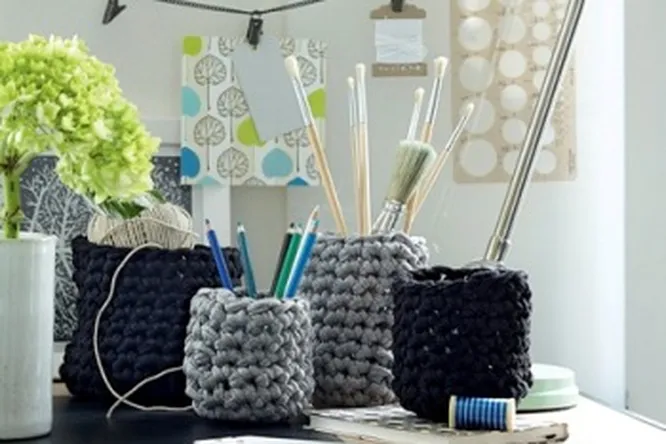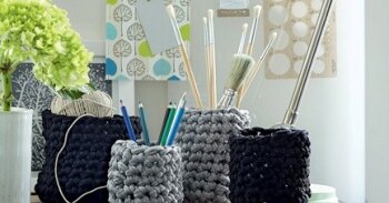 Чтобы создать очаровательные вязаные подставки для письменных принадлежностей, вам понадобится пряжа из трикотажного полотна. Ее можно купить уже готовую, но, если подходящей найти не удастся, нити не так сложно изготовить самостоятельно. Просто разрежьте старые футболки по горизонтали на ровные тонкие полосы и растяните их так, чтобы трикотаж скрутился в нить. Сделать это не сложно, и в Интернете можно найти массу видео и фото мастер-классов, обучающих этой технике. Начинайте вязать контейнер по кругу, ряд за рядом добавляя петли. Чем больше рядов вы свяжете, тем выше будет подставка. После того как будет связан последний ряд, руками расправьте подставку, придав ей аккуратную форму. Попробуйте проявить фантазию и сделать верхний ободок подставки другого, контрастного цвета. Или разделить подставку на две части: свяжите нижнюю — в одном оттенке, а верхнюю — в другом.