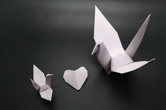 Возьмите квадратный лист бумаги, согните его по очереди по обеим диагоналям и разверните. Теперь согните пополам в длину и ширину, в последнем положении оставьте. Возьмите его в руки «домиком» и сведите за боковины к центру, как показано на рисунке. Загните крайние участки получившегося ромба треугольниками к центральной оси. Разогните верхний слой обратно, а часть верхушки загните вниз. Поднимите верхний слой бумаги. Загните левый треугольник вправо. Согните ромб пополам по горизонтали. Выпустите внутренние треугольники справа и слева наружу. Потяните заготовку лебедя из бумаги в указанных точках сначала по горизонтали... Согните край левого треугольника в форме головы лебедя.