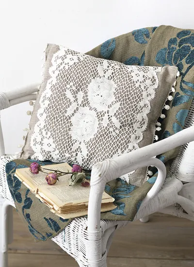 Используйте великолепное сочетание тонкого кружева и грубого льна для декорирования подушек.