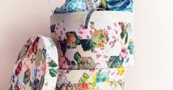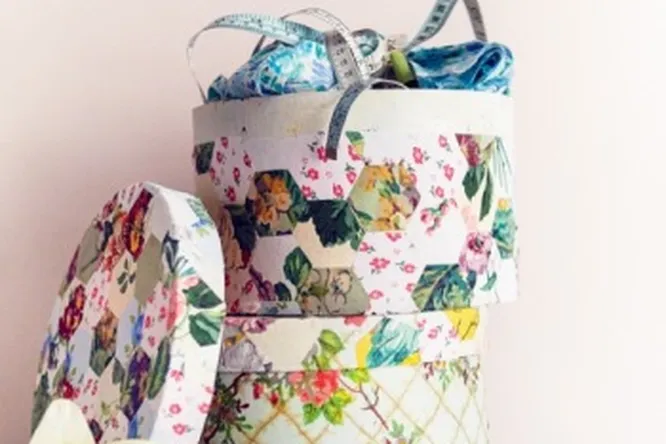 Переведите трафарет на ткань, используя растворимый в воде маркер. Вырежите шестиугольники. Если коробка уже была ярко раскрашена, покройте ее слоем бледной эмульсии, чтобы краска не просвечивала. Начните оклеивать коробку из центральной точки боковой панели. Нанесите ПВА и приклейте первый кусочек «мозаики». Выстраивайте узор, чередуя лоскутки и обклеивая остальные кусочки по кругу. После нанесите на ткань еще один слой клея.