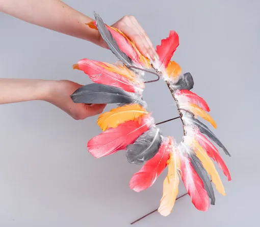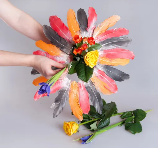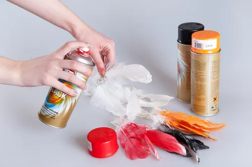 Если вы также используете белые перья, раскрасьте их в разные цвета с помощью спрей-краски. Помните, что краска имеет резковатый запах, поэтому заняться покраской следует на улице, либо на балконе. Красить перья лучше заранее, чтобы они успели высохнуть.