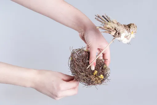 Используя тонкие березовые веточки и кокосовое волокно, попробуйте свить руками небольшое гнездо. Поэтапно скрутите веточки в круг, добавляя кокосовое волокно, закрепить конструкцию можно при помощи шпагата. Декоративное гнездо можно также приобрести в магазине для творчества.
