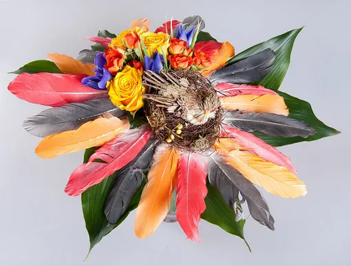 С помощью проволоки (закрепив шпажку к одной из ножек) прикрепите к букету гнездо с птицей.