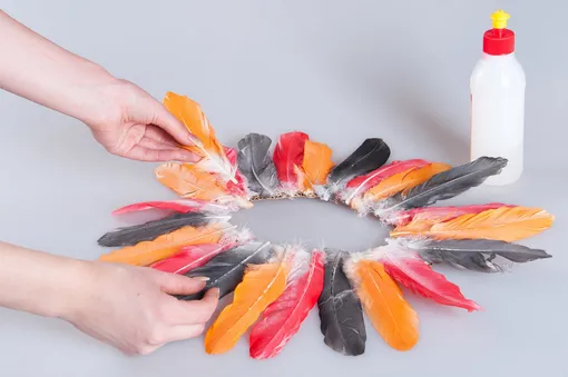 Прикрепите перья к картонному каркасу с помощью клея, чередуя цвета.