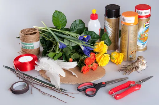 Клей, тейп-лента, флористическая проволока, ножницы и секатор