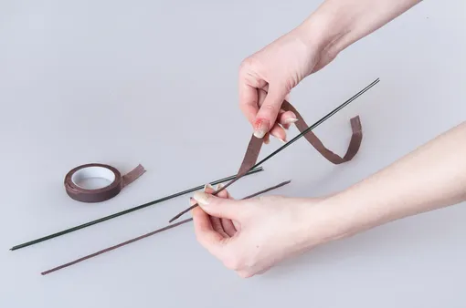 Для каркаса необходимо сделать ножку. Мы использовали для этого флористические проволоки, но можно обойтись и обычной алюминиевой проволокой. Флористические проволоки достаточно тонкие, поэтому для каждой ножки возьмите несколько штук и обвяжите их тейп-лентой (как показано на картинке). Таких ножек необходимо сделать 3 штуки.
