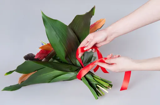Наш яркий праздничный букет готов. Не забудьте поставить его в воду.