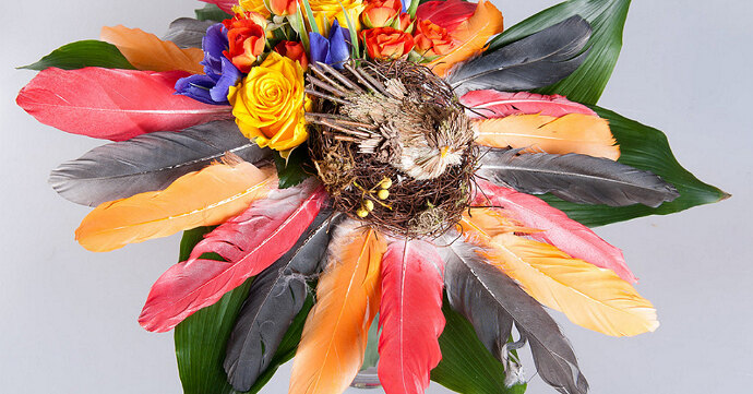 С помощью проволоки (закрепив шпажку к одной из ножек) прикрепите к букету гнездо с птицей.