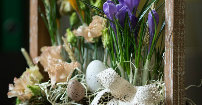 На этом наша весенняя пасхальная композиция готова! Украсьте ей дом или подарите близким, мы уверены, что такой подарок надолго запомнится своей оригинальностью, а благодаря грунту и оазису, которые можно поливать — свежестью на долгое время.