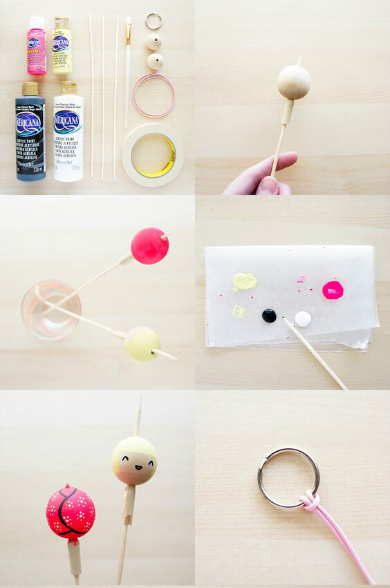 Раскрасьте одну из бусин, сделав из нее голову куколки или человечка, а другую превратите в кофточку, платье или куртку. На фото показано, как удобнее бусину красить. После, накиньте шнурок на кольцо для ключей, затяните петлей, проденьте обе бусины через него, а конец завяжите узлом. Очень просто!