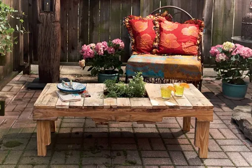 Распилите старый деревянный поддон-палету надве части поцентральной опорной балке (она будет служить удобной направляющей). Снимите доски ипереставьте их плотнее друг к другу, а старые гвозди удалите. Чтобы вцентре столика осталось место для ящика с растениями, три центральные доски необходимо прорезать врезной фрезой. Ножки столика можно сделать израспиленной опорной балки, прикрутив ее с помощью саморезов.