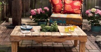 Распилите старый деревянный поддон-палету надве части поцентральной опорной балке (она будет служить удобной направляющей). Снимите доски ипереставьте их плотнее друг к другу, а старые гвозди удалите. Чтобы вцентре столика осталось место для ящика с растениями, три центральные доски необходимо прорезать врезной фрезой. Ножки столика можно сделать израспиленной опорной балки, прикрутив ее с помощью саморезов.