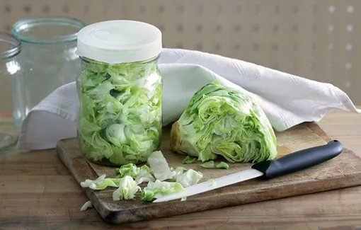 Вымойте и высушите салат «айсберг» или «ромэн», нарежьте, а затем как следует высушите (для этого можно взять центрифужную сушилку). Положите зелень в банку и закройте крышкой, используя систему вакуумирования.