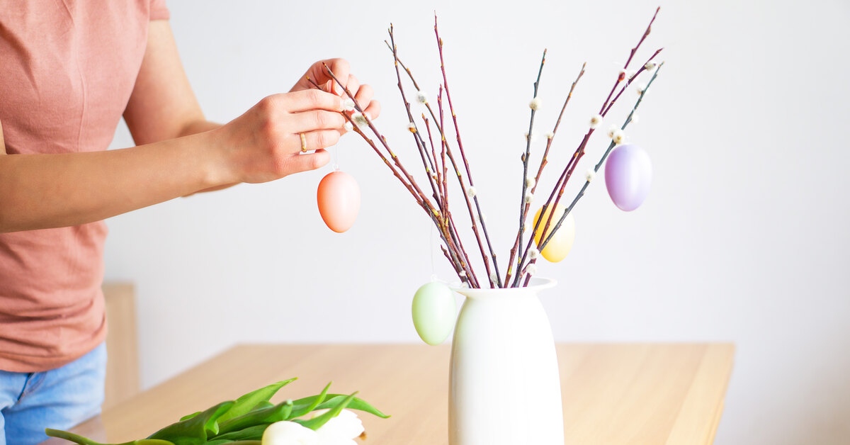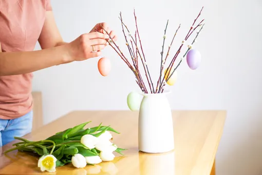 В 2026 году актуален минимализм. Не стоит перегружать пасхальное дерево в вазе, достаточно 5-9 подвесок на пышный букет. Для создания композиции лучше всего выбирать ветви с четкой графикой. Традиционный вариант — верба с мягкими серебристыми «котятами», более оригинальный — причудливо изгибающиеся ветки лещины. Если заранее поставить в воду ветви вишни или березы, к Пасхе на них как раз проклюнется нежная листва.