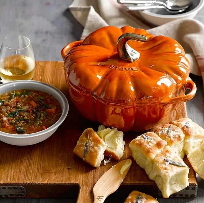 Этот кокот изготовлен из глины, покрытой эмалью из стеклянного порошка. Подходит для использования в духовке и микроволновой печи, а ещё его может использовать для красивой осенней сервировки.