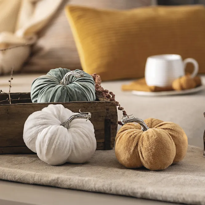 Бархатные тыквы тоже поднимут настроение, а несколько штук на столе или на полке будут очень эффектно смотреться. Фигурки выполнены из пластика и обернуты в чехлы из бархатистого текстиля осенних тонов, а ещё их приятно держать в руках.
