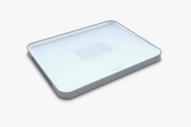 У этой разделочной доски Joseph Joseph Cut&Carve обе стороны рабочие. Одна оснащена специальными зубцами для плотной фиксации мяса, другая – гладкая для нарезания любых продуктов. Благодаря небольшому наклону и бортикам по краям, вся лишняя жидкость и кусочки продуктов аккуратно собираются и не пачкают поверхность стола. Обе стороны располагают нескользящими краями и удобными для придерживания стенками.