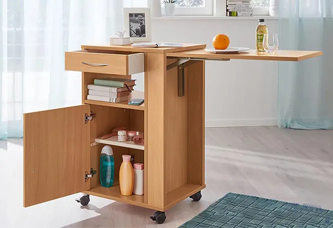Раскладные столы популярны ещё с советских времён. Компактный стол-книжка использовался как тумба, а в праздники его выдвигали в центр комнаты и раскладывали для приёма гостей. Современные раскладные столы выпускают самых разных дизайнов и размеров, к тому же они могут быть оснащены дополнительными опциями: выдвижными ящиками для хранения мелких предметов, полочками, нишами, шкафчиками, которые значительно увеличивают функционал мебели.