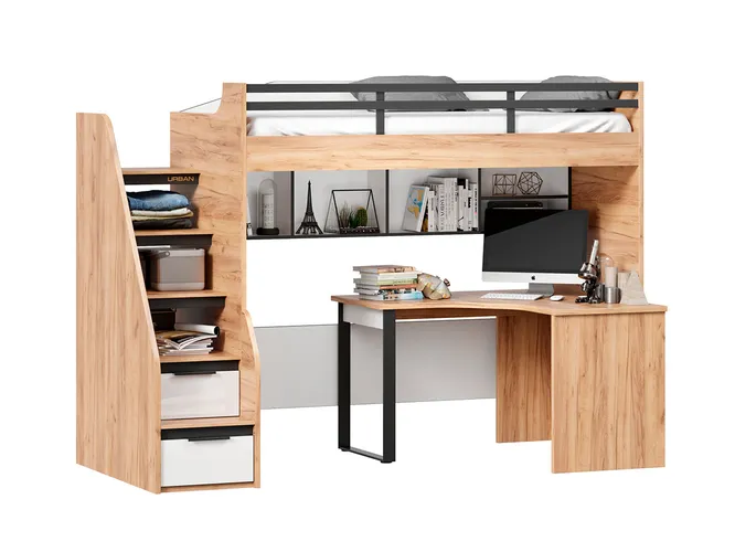 Ещё одно рациональное решение для детской комнаты — кровать-чердак. В свободную под кроватью нишу можно поставить, например, диван или сделать игровое место. Если в семье двое детей, в нишу можно поставить ещё одну кровать. Для ребёнка школьника лучше приобрести кровать-чердак с письменным столом. Есть варианты компактной мебели с полками, которые понадобятся для учебников, игрушек и каких-то мелочей. Лестница в данном исполнении тоже функциональна, поскольку нижние ступеньки являются ещё и ящиками для хранения.