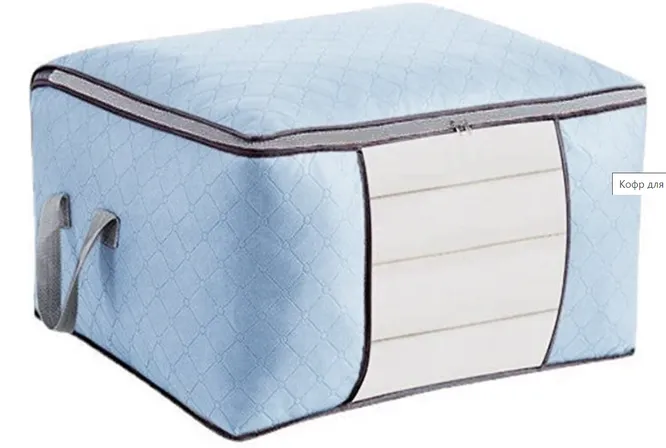 Еще одна удобная вещь – сумка на молнии, в которую можно сложить одежду, постельное бельё, полотенца и другой домашний текстиль и аккуратно уложить на полках шкафа. Сумка сделана из прочного материала, а, при необходимости, её можно стирать. Материал пропускает воздух, поэтому одежда и другие вещи дольше останутся свежими. А благодаря ручкам, сумку легко выдвигать и поднимать.