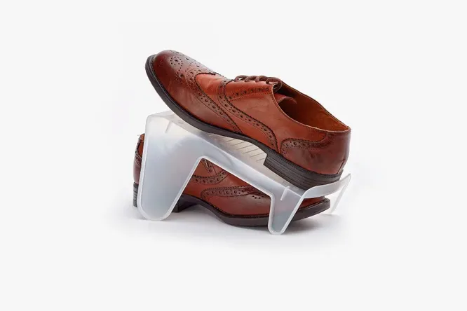 Такой органайзер для обуви позволяет удобно расположить пару туфель, кроссовок или босоножек на полу или на полке стеллажа и сэкономить полезное место. Конструкция изготовлена из полупрозрачного полипропилена. Материал легко отмывается от пыли и грязи и долго служит. Органайзер подходит для обуви больших размеров. Теперь на обувнице можно компактно расположить в два раза больше ботинок и кроссовок.