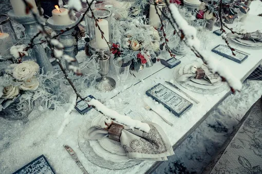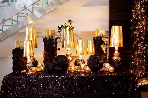 Если вы ожидаете большое количество гостей, то уместно будет заказать рассадочные карточки с оригинальным дизайном. В центре стола можно использовать хвойные композиции или небольшие декоративные ели — для этого подойдут живые и искусственные деревья. А если вы хотите следовать модным тенденциям — поставьте на стол посуду медного или стального цвета, плоские тарелки из черного стекла, но только если это будет гармонично сочетаться с общей обстановкой.