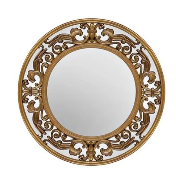 Такое настенное зеркало в стиле ампир станет украшением квартиры. Золотистая рама из металла и пластика с витиеватым растительным узором добавит интерьеру особую романтическую нотку, мысленно отсылая во времена рыцарей и дворцов. Подойдет как для ванной, так и для прихожей или спальни. Размер: 62*62 см.