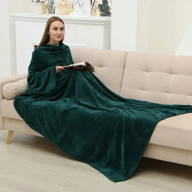 Плед с рукавами это что-то среднее между классическим пледом и халатом. Идеально подойдет для тех, кому лень вылезать из уютного покрывала даже, чтобы заварить себе чай.
