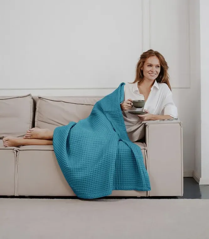 Вафельная ткань получила свое название благодаря характерной структуре ткани с рельефными ячейками, чем-то напоминающей вафли. Эта особенность не только придаёт пледу привлекательный «уютный» внешний вид, но и обеспечивает отличные теплоизоляционные свойства, что делает его идеальным для использования в любое время года.