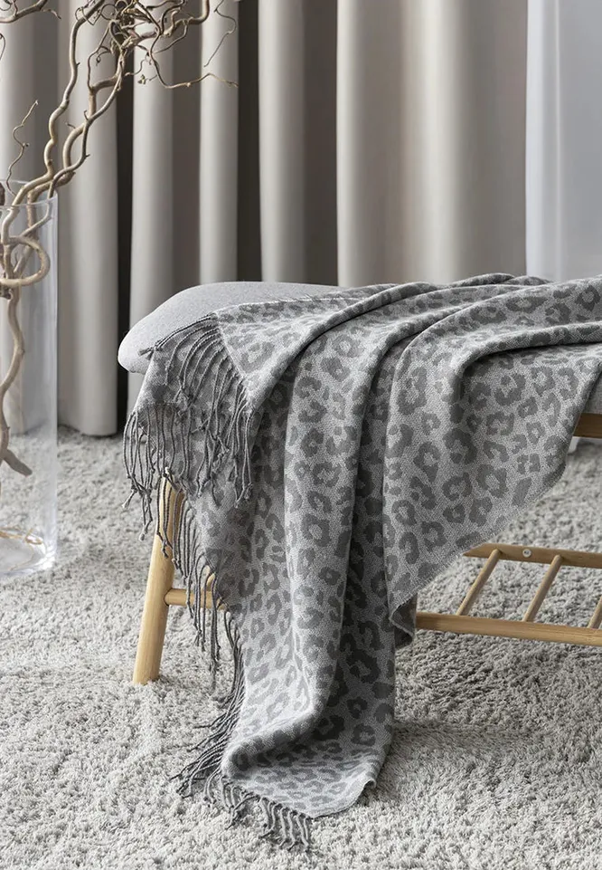 Ещё один вариант, который добавит интерьеру изюминку — плед с леопардовым принтом. Этот вариант выполнен в монохромных тонах, что позволит вписать его в любой интерьер.