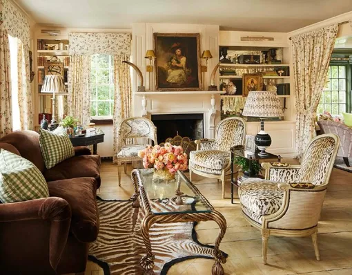 Ну и, конечно, цветочные мотивы — это визитная карточка стиля. Обои с классическим рисунком, шторы и пледы с цветочным принтом, вышитые подушки — всё это очень уместно. Главное — не бояться миксовать разные узоры, не гнаться за идеальной симметрией, а стремиться к живой атмосфере.