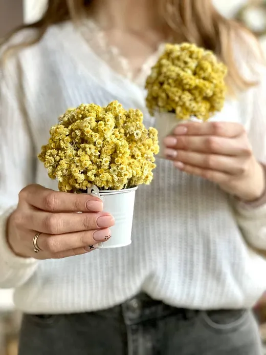 Мода на сухоцветы и стабилизированные цветы сохраняется уже не первый год, и дизайнеры продолжают активно использовать их в интерьерах. Преимуществ много: гипоаллергенны, будут радовать несколько лет, не требуют никакого ухода. Букеты сухоцветов можно ставить не только в вазу. С их помощью оформляют стены в виде гирлянд или панно, помещают под стекло в рамках и даже подвешивают пучками к высоким полкам или карнизам. Сейчас несложно купить готовый букет или любую композицию в стекле, ведрах или корзинах.