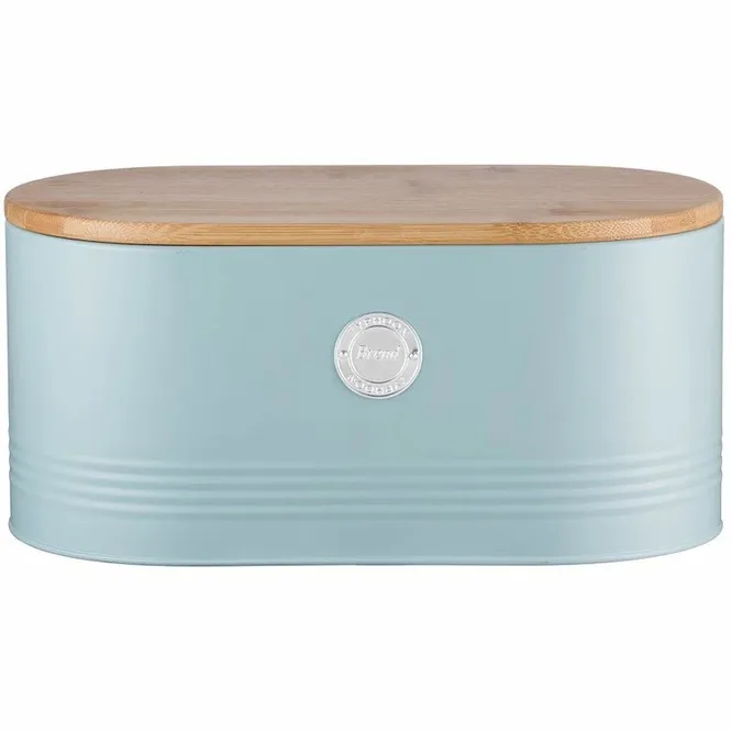 А рабочую зону столешницы украсит хлебница небесно-голубого цвета, которая на долгое время сохранит хлеб и выпечку свежей. Она изготовлена из прочной углеродистой стали и дополнена деревянной крышкой, которую можно использовать вместо разделочной доски.