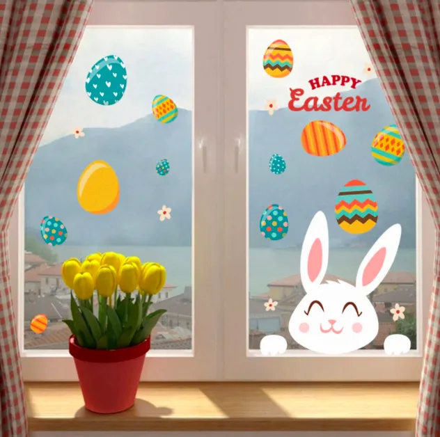 Думаете, что украшать окна принято только на Рождество? Нет, на Пасху тоже можно создавать настроение себе, соседям и прохожим. В этом наборе есть смешной кролик, несколько вариантов яиц с разным орнаментом и надпись Happy Easter, все легко отрывается и не оставляет следов. Можно украсить окно в кухне или детской комнате.