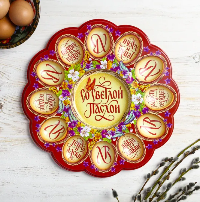 Удобное пластиковое и очень красивое блюдо с пожеланиями, рассчитанное на 12 яиц. В центр блюда можно поставить небольшой кулич. Можно выбрать блюдо с разным оформлением и в разных оттенках. Подставка лёгкая, поэтому её будет удобно брать с собой на пасхальную службу.