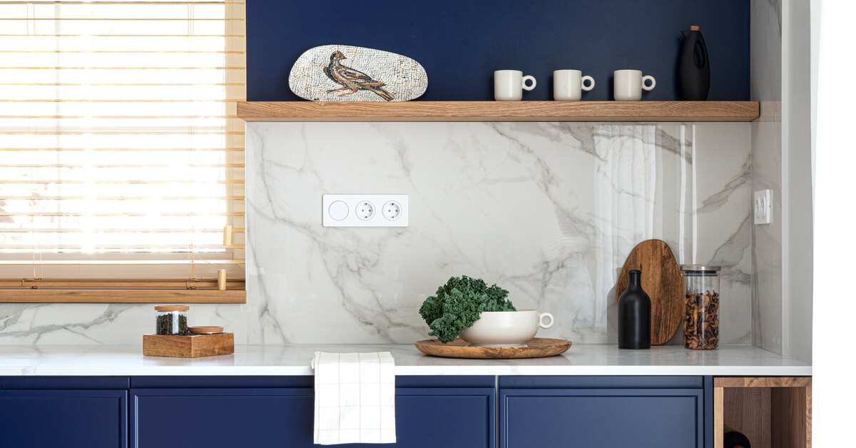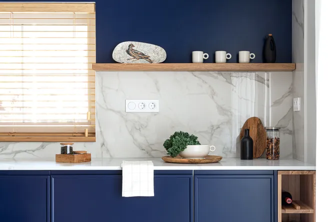 Дом с тёмно-синей кухней, камином и хранением под лестницей