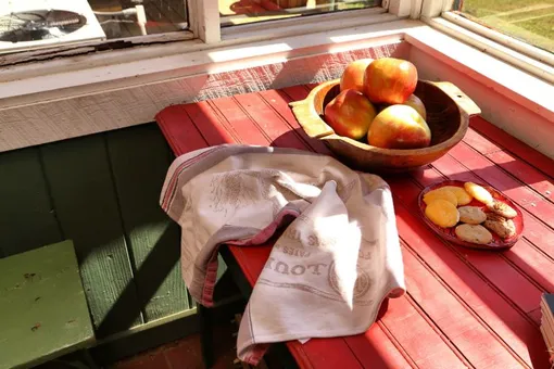 Главное здание состоит из двух построек, соединенных друг с другом. Здесь же, на ферме, есть мастерская и школа, а вокруг — ручей с чистой водой, яблоневый сад и густой лес.