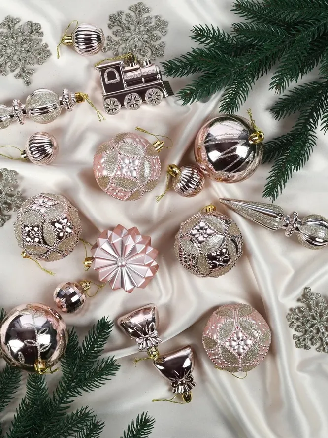 Если наряжаете елку с нуля, проще всего начать с готового набора елочных украшений. Это не только удобно, но и выгодно, ведь такие комплекты обойдутся дешевле, чем покупка каждой игрушки. Чуть-чуть золотого сияния или мягкого перламутра добавят утончённости, крупные прозрачные шары или металлические фигурки придадут блеска, а гирлянды с тёплым светом создадут уютное мерцание.