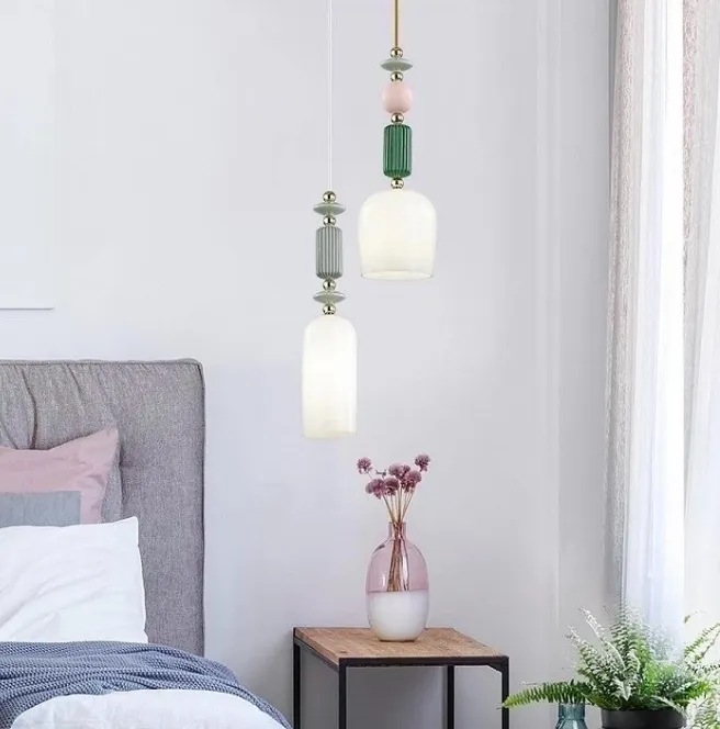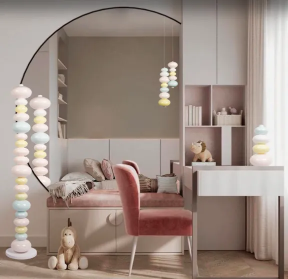 Ещё один пример акцентного света в интерьере. Пастельные оттенки напоминают пирожные макарон, а лёгкий дизайн делает светильник идеальным для детской комнаты. Стеклянный плафон, металлический корпус и тёплый свет радует глаз и поднимает настроение.