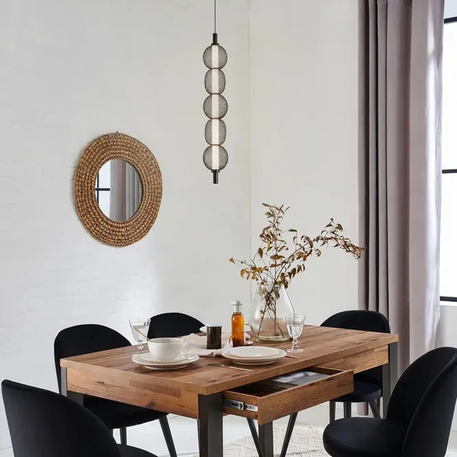 Для зон до 6 м² отлично подойдёт подвесной светильник в чёрном металле: лаконичный и графичный. Тёплый белый свет придаст мягкость помещению и создаст уют в кухне, столовой или небольшой гостиной. Встроенные светодиоды сэкономят электроэнергию, а регулируемый подвес легко подстроится под необходимую высоту.