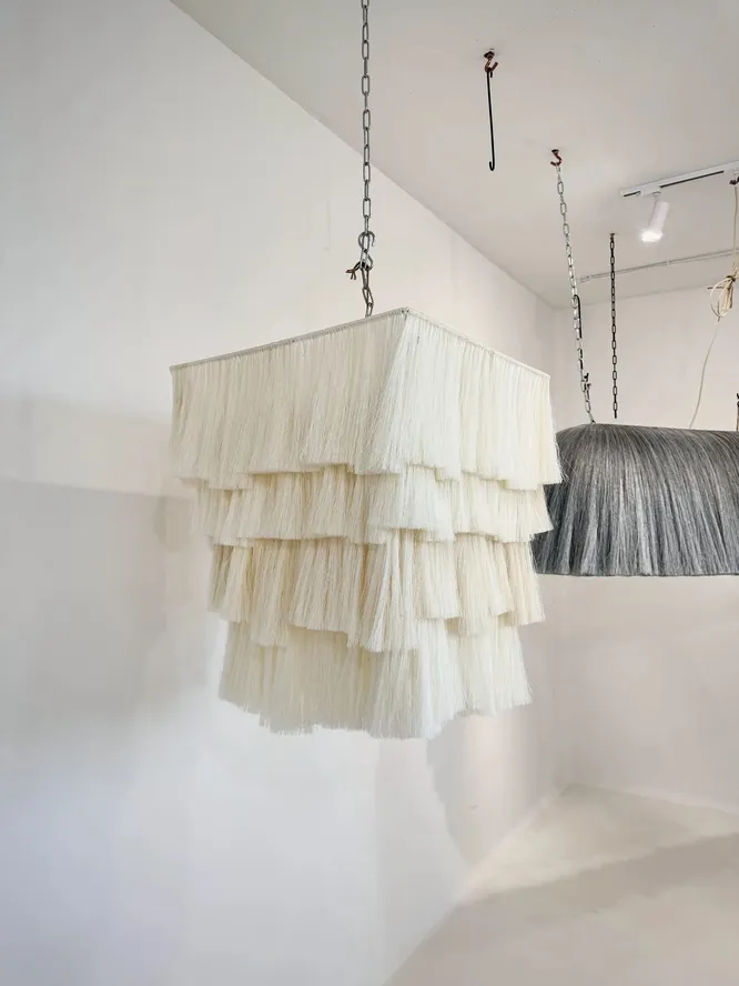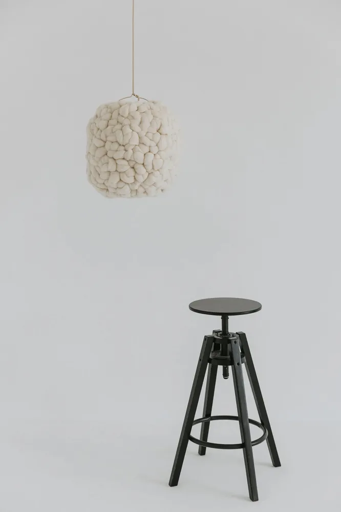 Этот авторский светильник собран как текстильная скульптура — из шерсти мериноса, мягкой, пластичной и живой. Специальная техника ткачества, разработанная дизайнером, позволяет работать с объёмом. А благодаря материалу и форме свет рассеивается неравномерно — будто течёт по поверхности и становится почти осязаемым.