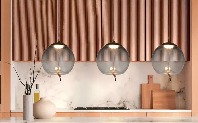 Подвесной светильник с резным деревянным плафоном — простой и выразительный акцент для кухни или гостиной, особенно если хочется добиться ритма в пространство. Свет просачивается сквозь геометрию резьбы и ложится на стены мягкими рисунками.