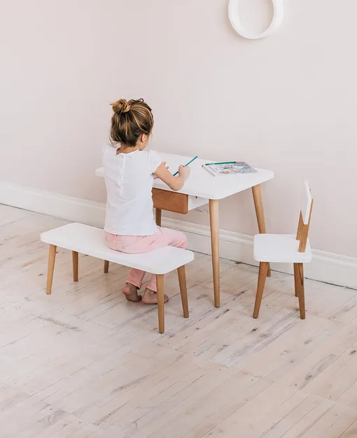 Столик для занятий и творчества малышей от первого года жизни особенно удобен в комнатах разнополых детей. Все канцелярские принадлежности можно хранить в удобном ящике под столешницей.