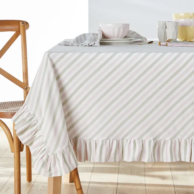 В этой скатерти прекрасно всё: абсолютно очаровательный тренд на рюши, полоска, которая напоминает комбинезоны кроликов с пасхальных открыток и нежные пастельные оттенки весны.