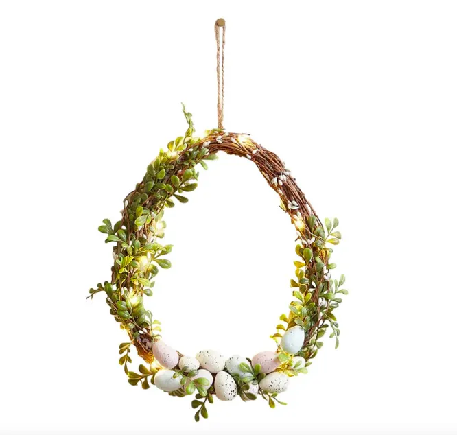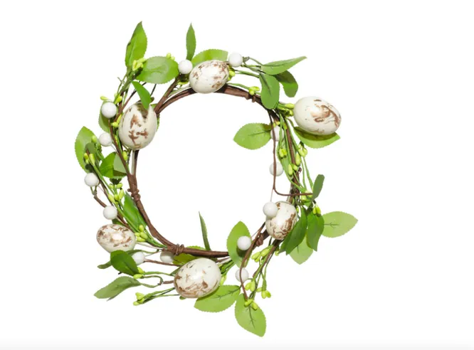Мы уже привыкли к рождественским венкам в украшении дома, но пасхальная версия выглядит тоже очень симпатично. Можно приобрести основу из веток и сделать венок самостоятельно, добавив, к примеру мох и искусственные перепелиные яйца, а можно приобрести готовый вариант.
