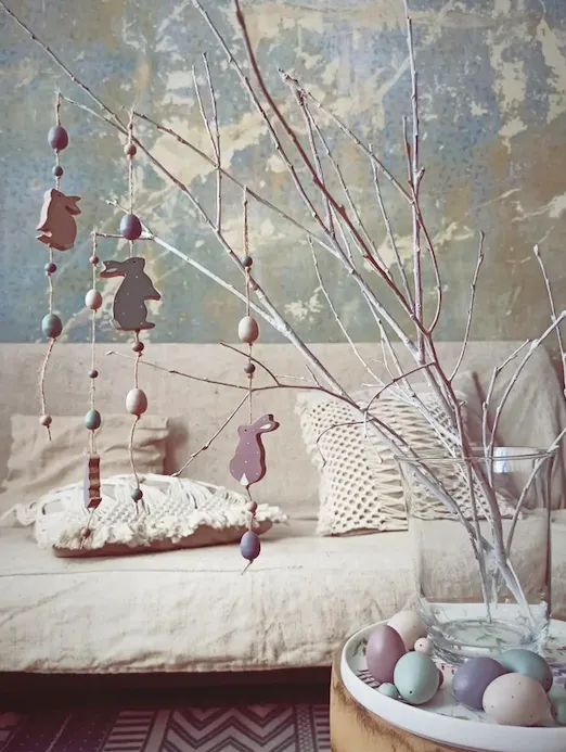 Если дома нет пышных весенних букетов, не беда. Собираем веточки в ближайшем парке и несем домой. Ставим в вазу и украшаем подвесным декором, которого сейчас видимо-невидимо. Декоративные яйца, фигурки зайчиков, колокольчики, бусины и другие подвески – легкие и нежные, можно не боятся вешать их на самые тонкие ветки.