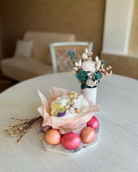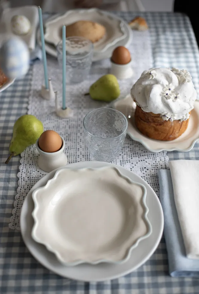 Ещё один вариант лотка для яиц с центральной подставкой для небольшого кулича. Нейтральный оттенок, удобная форма, которую можно будет использовать из года в год, — пожалуй, это идеальная формула для домашних сервировок.